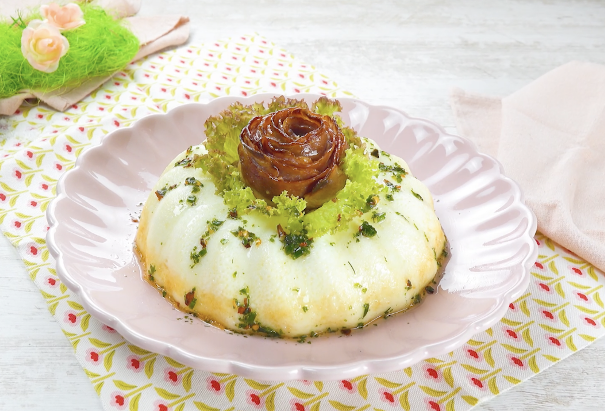 2.2 Once they’ve baked, take the bundt cake pan out of the oven and flip it over onto a serving plate or platter, removing the breakfast bundt cake while it’s still hot. Fry some bacon in the shape of a flower and place it on top of the breakfast bunt cake. Add some lettuce and garlic & herb olive oil on top, and your gorgeous breakfast bundt cake is ready to be served!