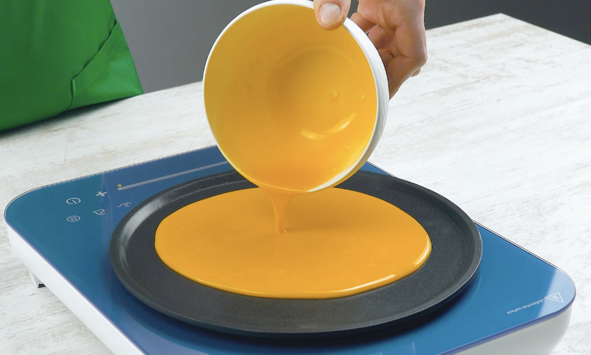 3.1 Separate the eggs and whisk the egg yolks and egg whites in separate bowls. Heat the crêpe pan or griddle on medium heat, pour in the egg yolks, and let them cook.