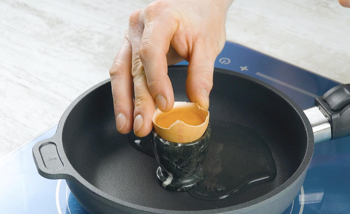 1.1 Place an egg cup in the center of the nonstick frying pan, crack the egg over it, and pour the egg white directly into the frying pan. Keep the egg yolk in the eggshell and place it in the egg cup.