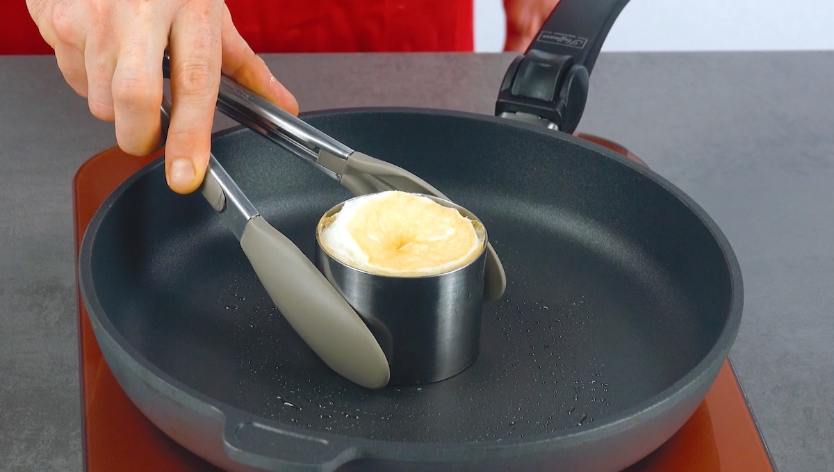 2.1 For 1 eggs Benedict soufflé, separate 1 egg and beat the egg white until light and fluffy. Grease a tall, round cookie cutter and line it with parchment paper. Spoon ½ of the beaten egg white into the cookie cutter and fry it briefly in a frying pan. Carefully place the egg yolk on top of the cooked egg white and cover it with the other ½ of the beaten egg white. Carefully flip the cookie cutter over and cook the beaten egg white on the other side.