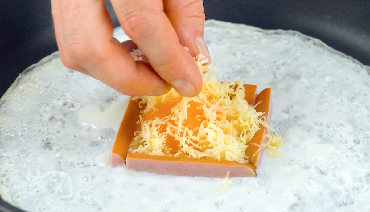 3.2 Fold the egg white that’s outside of the hot dog square inwards towards the center, sealing in the filling. Fry the stuffed egg-velope on both sides until golden brown and crispy. Sprinkle chopped parsley on top of the stuffed egg-velope to serve.