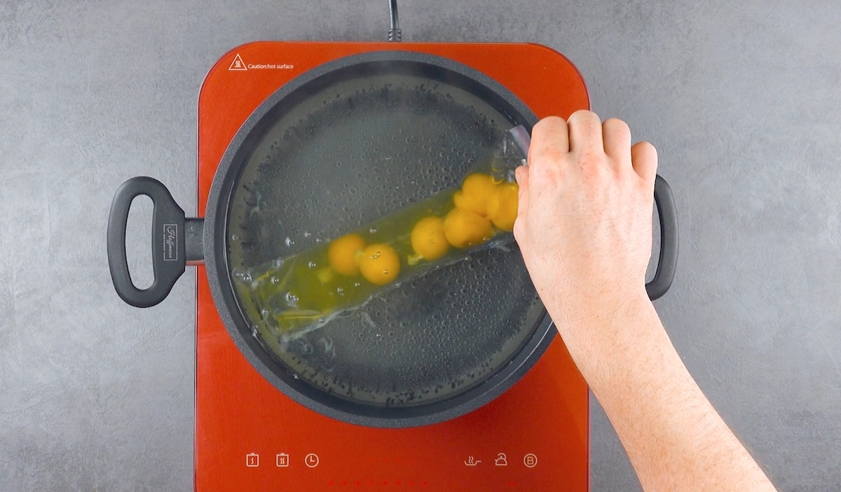 1.2 Pour some vegetable oil into the narrow plastic bag and move it around so that the interior is coated in vegetable oil, preventing the egg from sticking to it. Pour out any excess vegetable oil, then crack the eggs directly into the narrow plastic bag and seal it. Make sure the eggs are distributed as evenly as possible, then heat a pot filled with water on the stove. Bring the water to a boil, submerge the plastic bag filled with eggs in the boiling water, and cook the eggs for 10 minutes.