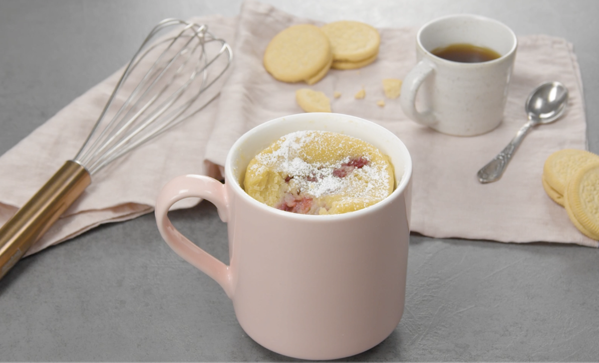 For the golden Oreo cake, put the golden Oreos and the milk in the mug. Let the cookies soak in the milk for 1 minute, then add in the flour, egg, sugar, and baking powder, and stir everything together with a fork until a smooth batter forms. Press the raspberries into the top of the batter, transfer the mug in the microwave, and heat everything at 600 watts or on high for 4 minutes. Dust the cake with powdered sugar to add the perfect finishing touch!
