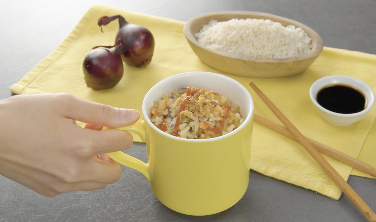For the fried rice, combine the rice, water, and sesame oil in a mug and stir everything together thoroughly. Transfer the mug to the microwave and heat everything at 450 watts or on medium for 7 minutes. Add in the egg, peas & carrots, diced red onion, and soy sauce; transfer the mug to the microwave; and heat everything at 600 watts or on high for 3 minutes. Garnish the fried rice in a mug with crispy fried onions and chili sauce.