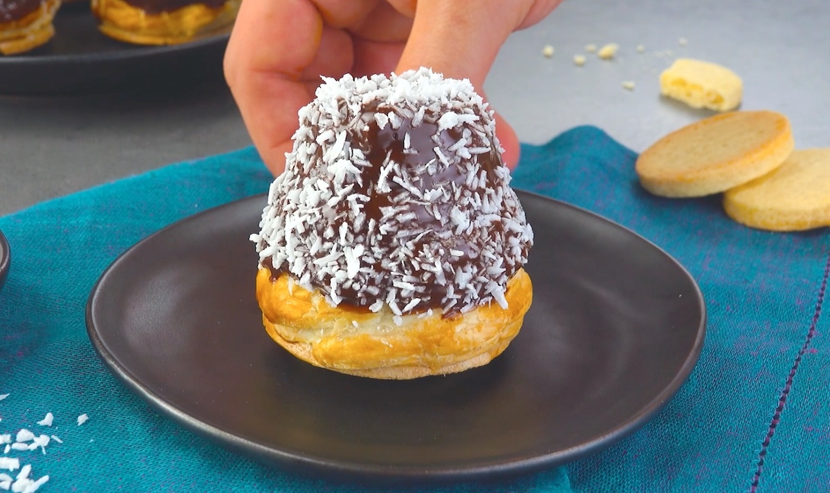 1.3 Temper the semi-sweet chocolate and heat it along with the butter over a double boiler, dip the puff pastry eclair cups into the tempered semi-sweet chocolate, and sprinkle them with shredded coconut.