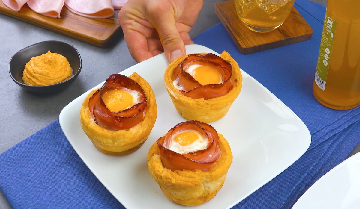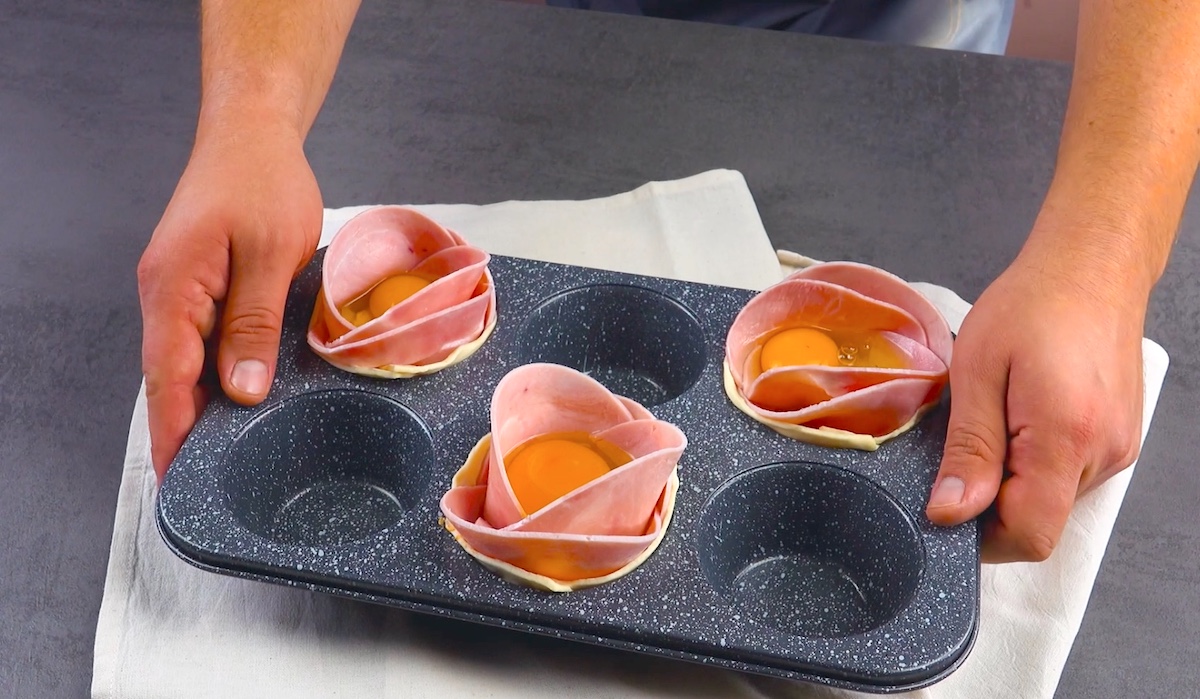 2.3 Cut the slices of ham in half and place 6 halves around the inside edge of the puff pastry dough, overlapping them slightly so that they look like the pedals of a flower. Crack 1 egg directly into each of the 3 filled wells of the muffin pan.