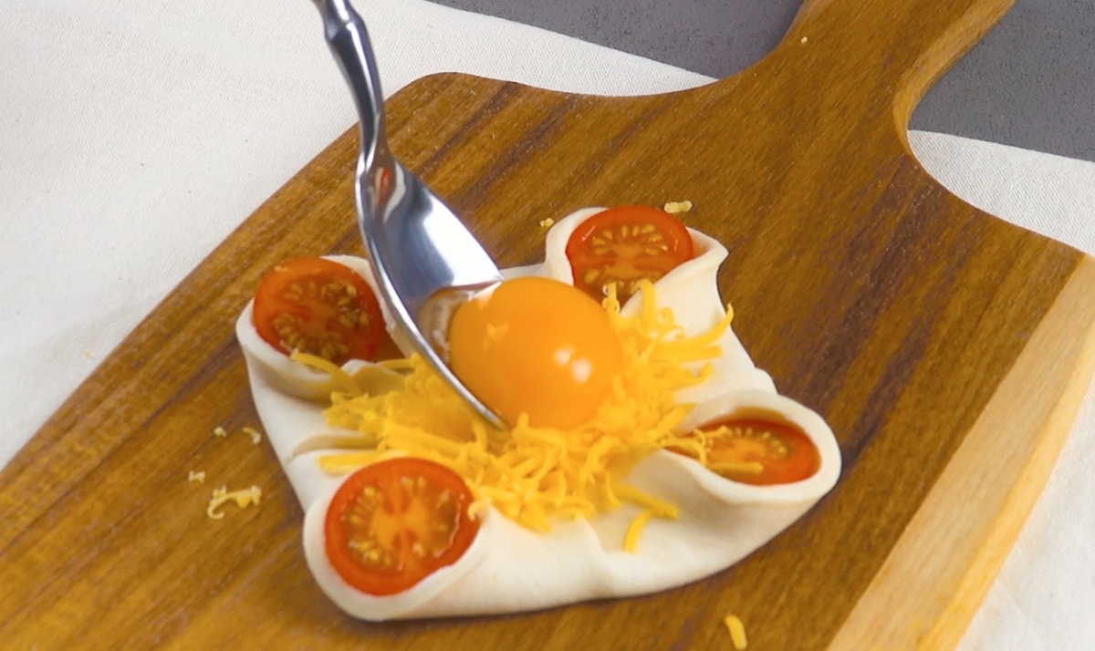 3.2 Fold the corners of dough inwards towards the center and press down lightly to keep the dough in place. Grate some cheddar cheese directly onto the center of the puff pastry pockets and spoon an egg yolk on top.