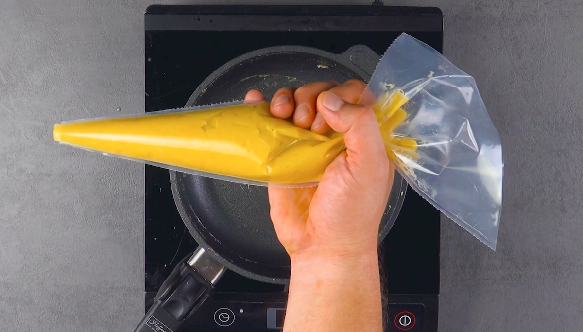 4.1 Preheat the oven to 350°F and line a baking tray with parchment paper. For the lemon curd, mix together the lemon juice, sugar, egg & egg yolks, and corn starch in a saucepan. Heat the mixture slowly until it starts to thicken, then stir in the butter. Once the butter is incorporated into the mixture, remove the lemon curd from the heat, let it cool slightly, then transfer it to a piping bag.