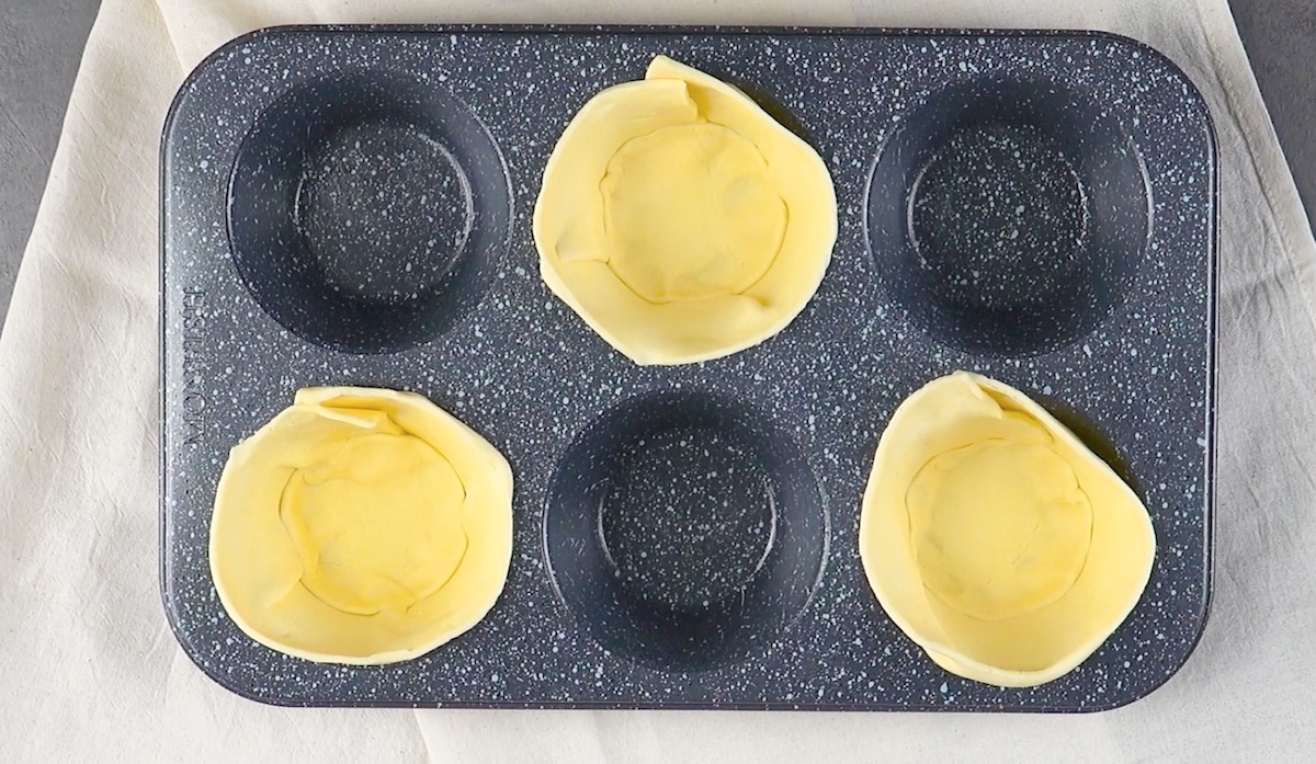 2.1 Preheat the oven to 350°F and grease 3 wells of a muffin pan. Cut the sheet of puff pastry dough into 3 equally sized 2 x 12-inch strips and 3 circles the same size as the wells of the muffin pan. Line the edges of the 3 greased wells in the muffin pan with 1 strip and 1 circular piece of puff pastry dough, letting the pieces of dough overlap slightly. Lightly press the edges together, sealing the dough.