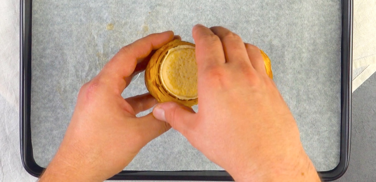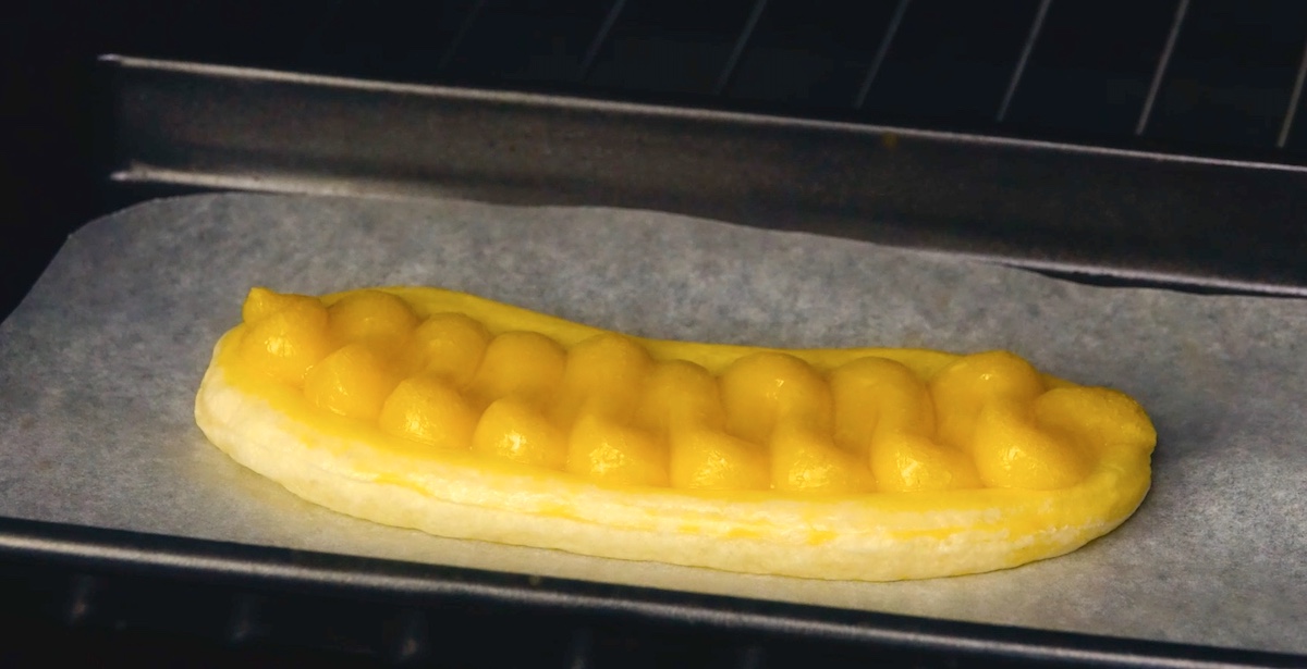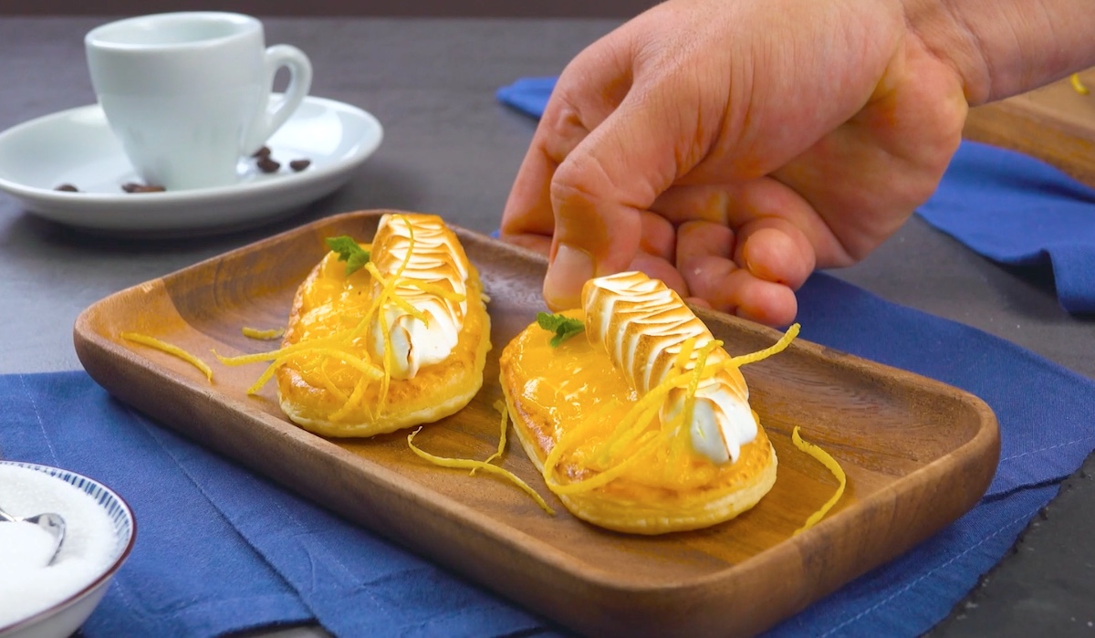 4.2 Cut the sheet of puff pastry dough into 8 ovular pieces using an ovular plastic lid. Whisk the egg yolks for the egg wash and brush it over the surface of the ovular pieces of dough. Pipe the lemon curd onto the pieces of dough, then place them on the baking tray. Transfer the baking tray to the oven and bake the puff pastry boats at 350°F for 15 minutes. Remove the baking tray from the oven and let the puff pastry boats cool.