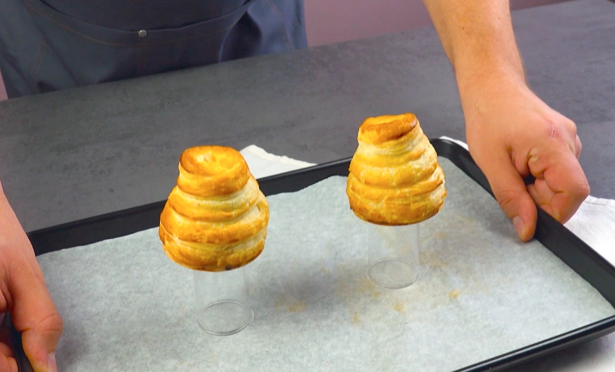 1.1 Preheat the oven to 350°F, line a baking tray with parchment paper, and position 3 tall glasses upside down on the baking tray. Cut the puff pastry dough into 6 equally sized strips, each 1 x 12 inches. Wrap 2 strips of puff pastry dough around each ice cream cup so that the outside is covered, then place them face down on the glasses on the baking tray. Whisk the egg yolks along with some milk to make the egg wash and brush it over the surface of the puff pastry dough. Transfer the baking tray to the oven and bake at 350°F for 15 minutes. Once the puff pastry ice cream cups have baked, remove them from the oven and let them cool.