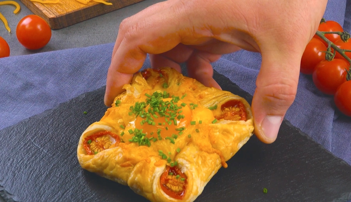 3.3 Whisk together 1 egg yolk and some milk for the egg wash and brush it over the surface of the puff pastry dough. Place the puff pastry pockets on the baking tray, transfer the baking tray to the oven, and bake them at 350°F for 15 minutes. Garnish the egg & cheese puff pastry pockets with chopped chives to serve.