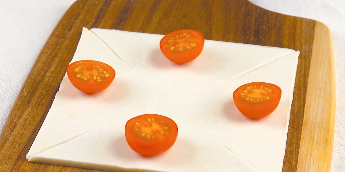 3.1 Preheat the oven to 350°F, line a baking tray with parchment paper, and cut the sheet of puff pastry dough into 2 squares, each 5 x 5 inches. Make 4 diagonal cuts, 1 from each corner of the square piece of puff pastry dough, making sure each cut stops after about 1 inch. Slice the cherry tomatoes in half and place 1 half in the center of each side of the dough.