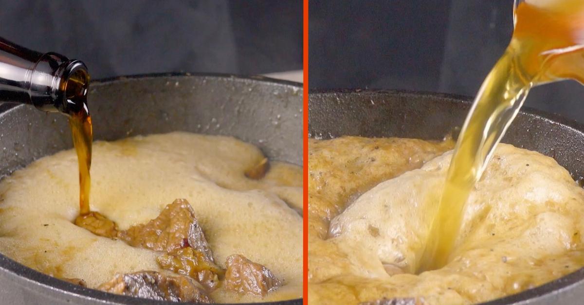 • Next, cut the meat into pieces and add them to the onions. Fry the meat until it's golden-brown before adding the mushrooms. Season everything with generous amounts of salt and pepper before pouring in the beer and beef stock. Leave it to simmer for about 90 minutes.