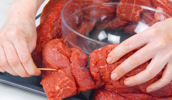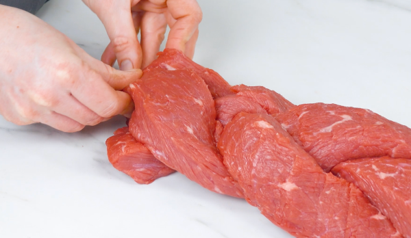 • Preheat the oven to 425Β°F. Prepare the round steak by removing any fat and tendons on it, then cut the whole steak in half lengthwise. The steak should have doubled in length so that it ends up being about 3Β½ feet long. Make 2 long cuts up almost the entire length of the beef, stopping before you cut all the way through to create 3 separate strands, each about 2 inches wide. Braid the strands of beef together until the entire round steak is braided, then secure the loose ends with a wooden skewer.