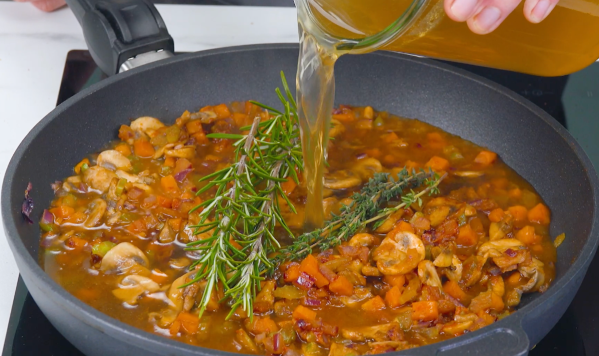 • Fry the diced red onions, sliced mushrooms, diced carrots, and diced celery in olive oil. Add in the balsamic vinegar, sprigs of thyme & rosemary, tomato paste, and mustard. Gradually pour the vegetable broth into the frying pan and let everything simmer until the gravy thickens slightly.