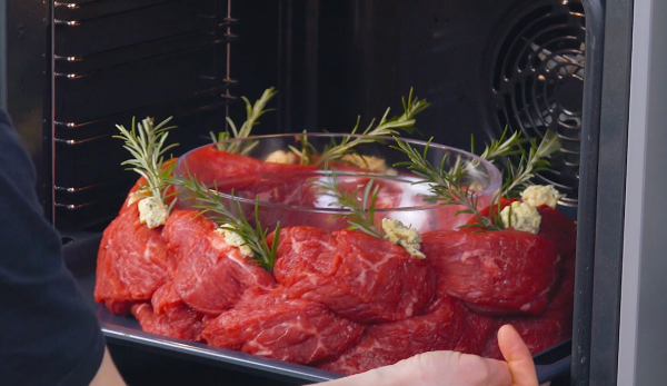 • Place a large oven-safe bowl on a baking tray, wrap the braided beef around it, and secure the braid in place with a wooden skewer. For the garlic & herb butter, stir together the softened butter, garlic, thyme, rosemary, salt & pepper. Distribute the garlic & herb butter around the braided beef, tuck sprigs of rosemary into the braid, and season the beef with salt & pepper. Transfer the baking tray to the oven and bake the braided beef bowl at 425Β°F for 13 minutes. Reduce the temperature in the oven to 325Β°F and let the braided beef bowl cook for another 10–15 minutes. Once it's done baking, remove the braided beef bowl from the oven and let it rest at room temperature for at least 15 minutes. Collect the drippings from the beef and set them aside for later.