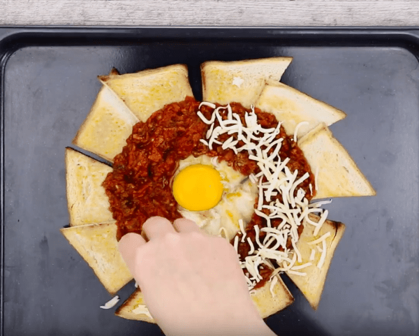 • Distribute the Bolognese sauce around the middle of the toast points, leaving a little space at both the inner and outer edges. Gently crack an egg into a small bowl. Then slide the egg from the bowl into the middle of the toast points.