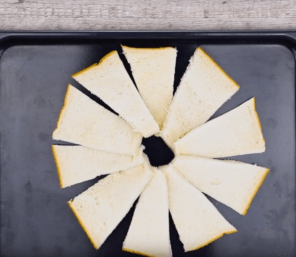 • Arrange the bread points in a circle with the blunted points to the inside so that you get a daisy effect. Press the slices together, flat, with a spoon. Bake in the oven at 425°F for 3 minutes.