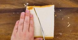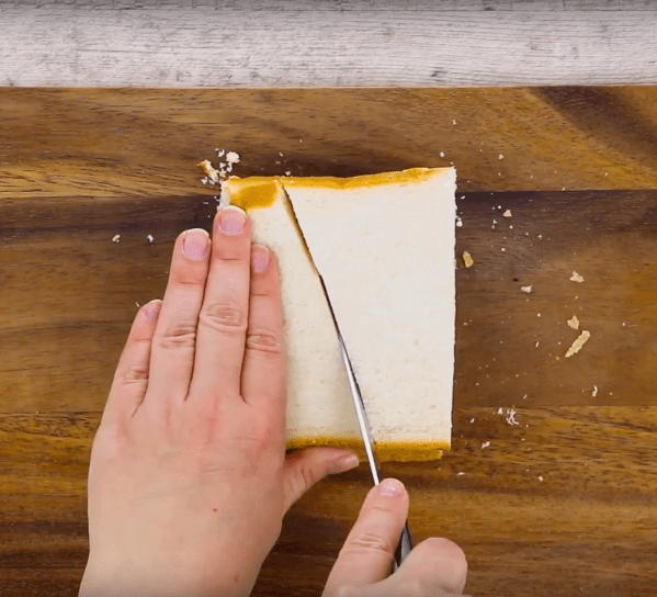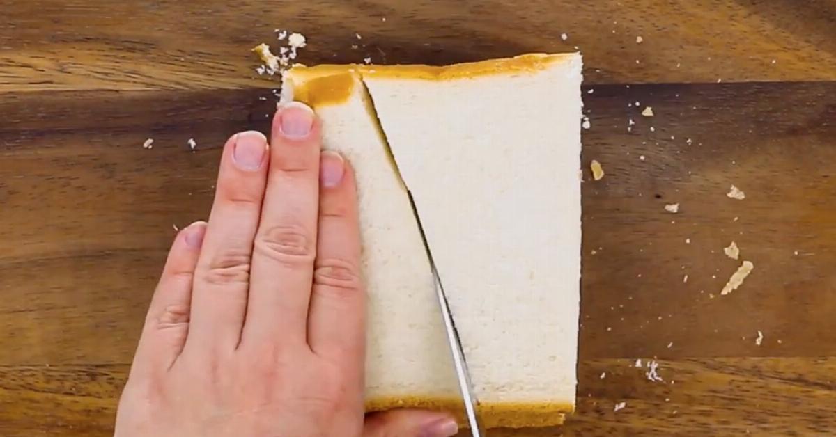 • Stack the slices of bread on top of each other. Cut the crusts off and then cut the bread diagonally so that you have one pointed end and one long end. Cut the tips off the bread points.