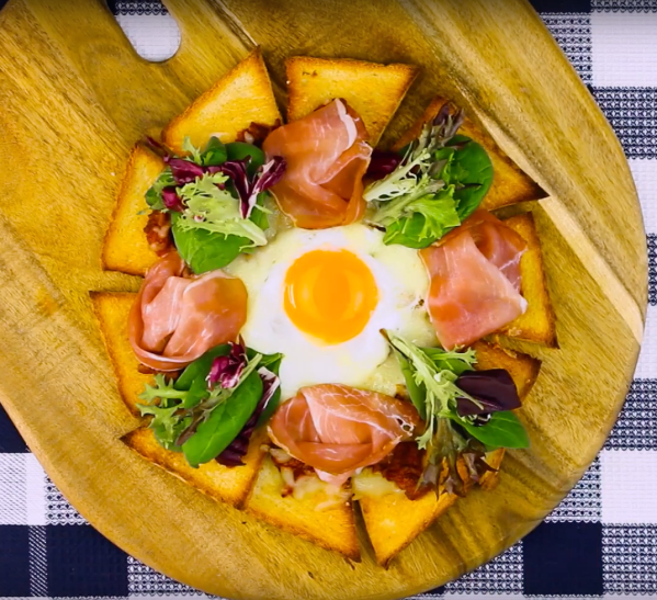 • Finally, decorate with ham (or prosciutto, for an authentic Italian touch) and mixed salad leaves. Voilà! Breakfast (pizza) is served!