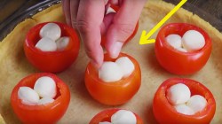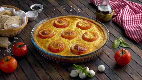 - Evenly space out the hollowed-out tomatoes in the pan and fill each tomato with 4 mini mozzarella balls. Pour the quiche mixture over the crust, around the tomatoes, and bake for 30 minutes at 340°F.
