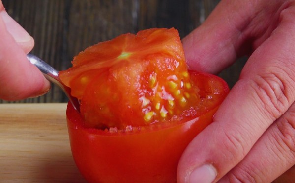 - Cut the tops off the tomatoes and hollow out the insides with a spoon.