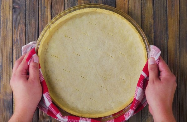 - Place the shortcrust pastry in a 12-13 inch quiche pan and pierce the bottom with a fork several times. Bake the crust for 15 minutes at 320°F.