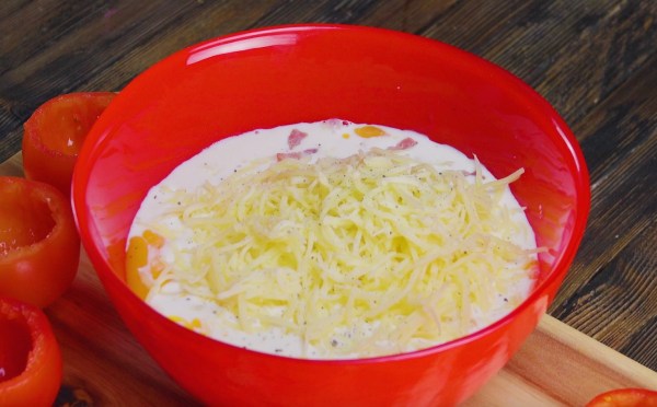 - Mix the cream cheese, eggs, milk, bacon bits, and shredded cheese together. Season with salt and pepper.