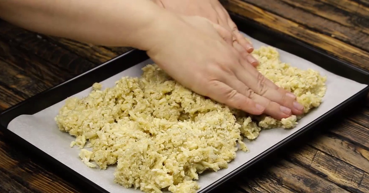 - Add all the ingredients and 3½ oz of the mozzarella to the grated cauliflower and season with salt and pepper to taste. Mix thoroughly and press the mixture onto a sheet pan lined with parchment paper.