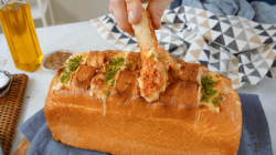 - Garnish the cheesy stuffed bread loaf with chopped chives and serve with the cheesy toast dippers.