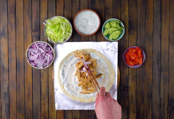 - Toast a tortilla, place it on a piece of aluminum foil, and cover the entire surface of the tortilla with the yogurt herb sauce. Use a sharp knife to cut small bits off the meat spit and place them in a wide strip down the center section of the tortilla. Then garnish with onions, lettuce, cucumbers, and tomatoes.