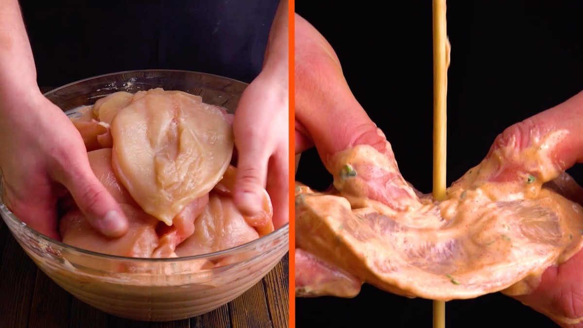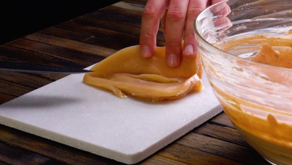- Make a butterfly cut in each chicken breast (cut it laterally about half way through), unfold the breast, and deepen the incision a bit further. Place all the butterflied chicken breasts in the yogurt sauce, cover the bowl with cling wrap, and let everything marinate for 2 hours.