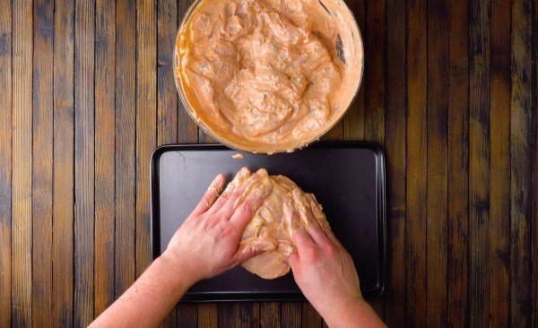 - Stick the onion half with the flat side down on one end of a 10-inch skewer and place it on a pan. Unfold the butterflied chicken breasts and lay them one after another on the skewer. Top off the skewer with the tomato half, with the flat side facing down. Cook your meat spit in an oven set to 300°F for 2½ hours.