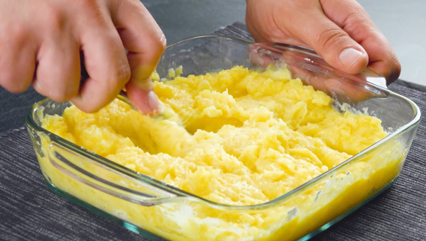 - Peel the potatoes and boil them in lightly salted water. Transfer the boiled potatoes to a casserole dish, add the egg and corn starch, mash until smooth, and spread the mixture out evenly in the casserole dish.