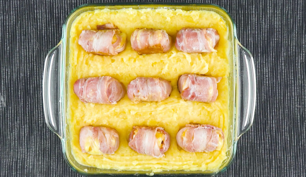 - Fry the bacon-wrapped nuggets on both sides in a pan over medium heat. Let the stuffed chicken nuggets cool and arrange them in rows of 3 on top of the mashed potatoes.
