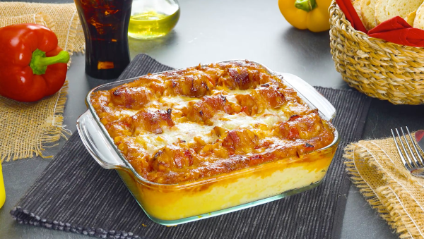- For the tomato pepper sauce, heat the olive oil in a pan over medium heat and sweat the red onion and garlic. Add the corn and bell peppers to the pan and briefly sautée. Stir in the crushed tomatoes, season with salt and pepper, and let the sauce simmer for about 5 minutes. Pour the finished tomato pepper sauce in between the stuffed chicken nuggets on top of the mashed potatoes and sprinkle shredded mozzarella cheese on top. Transfer the casserole dish to a preheated oven and cook at 325°F for 25 minutes.