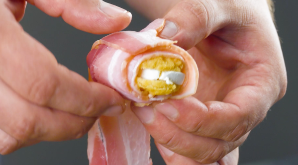 - Cut the chicken nuggets in half lengthwise, place a small piece of camembert cheese between the halves, and reassemble the chicken nuggets. Wrap 2 slices of bacon crosswise around each chicken nugget.