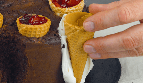 - Fill in the spaces you carved out with some vanilla cream and press 6 empty waffle cones into the cream.