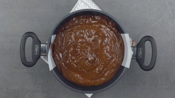 - Line the bottom of an 8-inch springform pan or an oven-safe pot with a wide strip of parchment paper and pour the cake batter in.