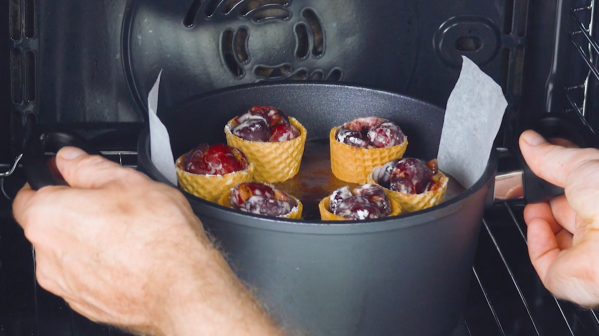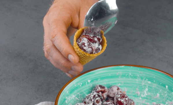 - Pit the cherries and mix them together with the cornstarch. Spoon the cherry mixture into 6 of the ice cream cones.