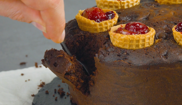 - Stick the filled waffle cones into the cake batter in a circular pattern and cover the cake with aluminum foil or an oven-safe lid so that the cherries don't burn in the oven. Transfer the chocolate cake to the oven and bake at 325°F for 95 minutes. Once the chocolate cake is done baking, remove it from the oven and let it cool completely.