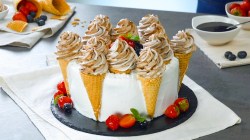 - Cover the rest of the cake with the vanilla cream, leaving the waffle cones uncovered.