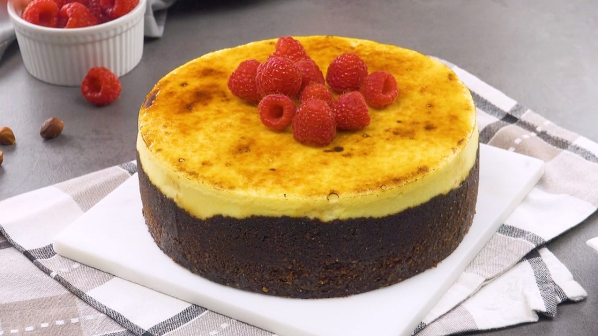 Crème brûlée is a popular dessert from France which is quite tasty thanks in large part to its crispy caramel coating. The name means “burnt cream,” because when you take a culinary torch to the surface of the cream, the sugar becomes caramelized. The only downside of the delicious dessert is that it’s quite small and therefore devoured pretty quickly. But because we have an insatiable appetite for crème brûlée, we’re making it bigger and better with chocolate and cheesecake!