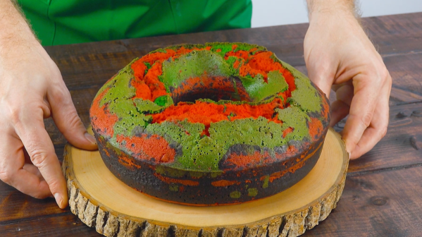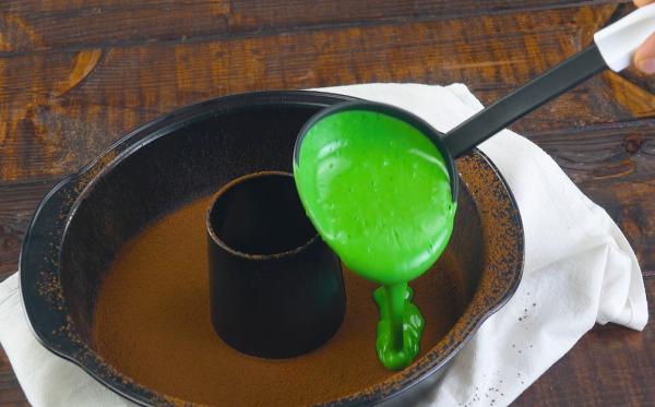 - Use a ladle to spoon a small amount of red cake batter into the bundt cake pan, then pass some of the cocoa powder through a sieve on top. Add a layer of green cake batter on top of the cocoa powder, then continue alternating between layers of cocoa powder and the red and green cake batters, making sure the 2 kinds of batter don't mix together.