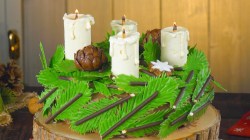 - Frost the cake with the chocolate buttercream frosting, then press the evergreen branches into the sides of it. Place the candles on top of the cake, then lightly push them into the frosting. Place the chocolate pinecones and some star cookies on top of the cake to finish off your beautiful Christmas wreath cake.
