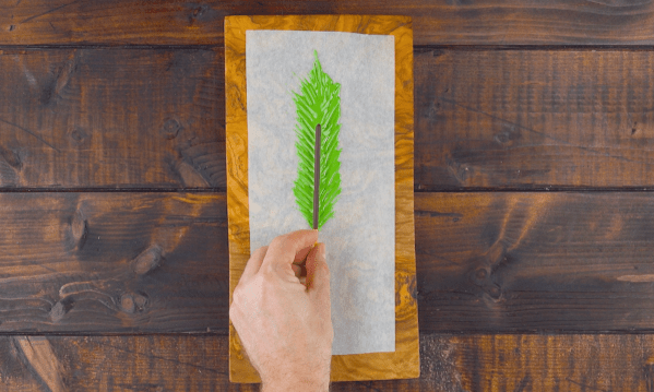 - For the evergreen branches, temper the white chocolate and stir in some green food coloring. Place a piece of parchment paper on your work surface and spoon a long strip of tempered green chocolate onto the parchment paper. Use 2 forks to spread it outwards from the center to make the chocolate look like pine needles. Place 1 chocolate Pocky Stick in the center of the tempered green chocolate design. Transfer the evergreen branches to the refrigerator and let them chill until the chocolate has hardened, then carefully remove them from the parchment paper.