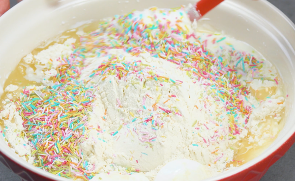 - Preheat the oven to 350°F. For the confetti cake, beat the egg whites and sugar in a large mixing bowl with a hand mixer until a firm meringue forms. Sift the flour through a sieve directly into the mixing bowl, then carefully fold in the flour, vegetable oil, milk, and rainbow sprinkles.