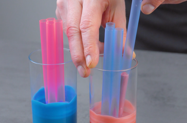 - For the chocolate candles, fill 2 tall shot glasses with colored chocolate Candy Melts – blue in one glass and pink in the other. Use a double boiler to melt the colored chocolate. Once the colored chocolate has melted, insert 4 extra-wide straws into each glass, filling the straws with the colored chocolate while it's still liquified. Seal the top of each straw using your finger and pull the chocolate-filled straws out of the glasses. Once all of the straws have been removed from the glasses, let everything cool and squeeze the colored chocolate candles out of the straws.