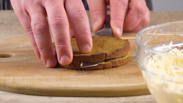 - Remove the cakes from the pans and cut them in half lengthwise. Spread the frosting on the cut surfaces and put the cakes back together.